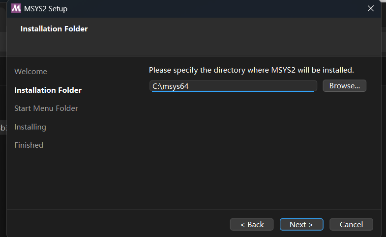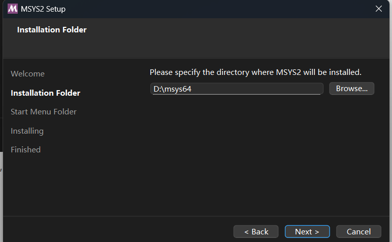 如果要将其安装到其他盘,如D盘,就修改路径为D:\msys64