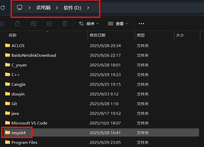 如果终端下载完成后自动关闭了终端界面,打开文件资源管理器找到下载msys2的路径:(以D盘根路径为例)