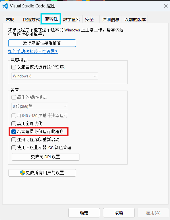 点击兼容性,在兼容性中勾选以管理员身份运行后点击确定