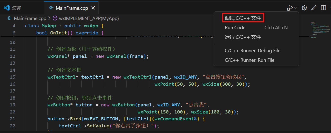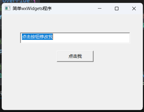 public:bool OnInit() override {// 创建主窗口wxFrame* frame = new wxFrame(nullptr, wxID_ANY, "简单wxWidgets程序", wxDefaultPosition, wxSize(400, 300));// 创建面板(用于容纳控件)wxPanel* panel = new wxPanel(frame);// 创建文本框wxTextCtrl* textCtrl = new wxTextCtrl(panel, wxID_ANY, "点击按钮修改我", wxPoint(50, 50), wxSize(300, 30));// 创建按钮,绑定点击事件wxButton* button = new wxButton(panel, wxID_ANY, "点击我", wxPoint(150, 100), wxSize(100, 30));button->Bind(wxEVT_BUTTON, [textCtrl](wxCommandEvent&) {textCtrl->SetValue("你点击了按钮!");});// 显示窗口frame->Show(true);return true;}