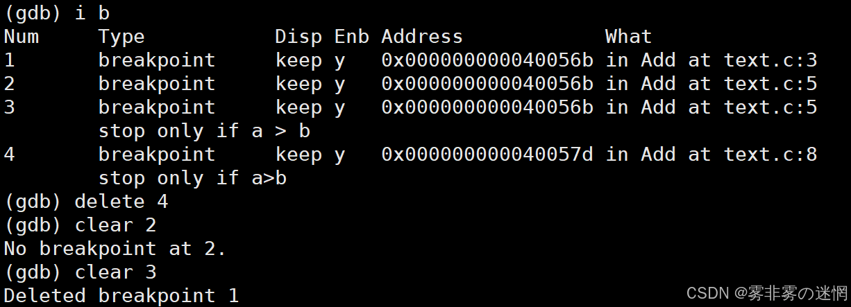 注意:删除操作的是查看断点之后的编号,而不是行数