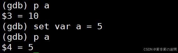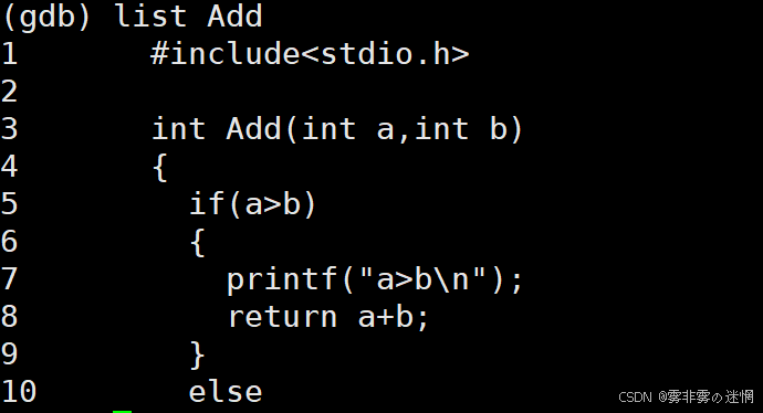 list 行号 | 显示指定行号附近的代码 | (gdb) l 5 (显示第 5 行附近) |