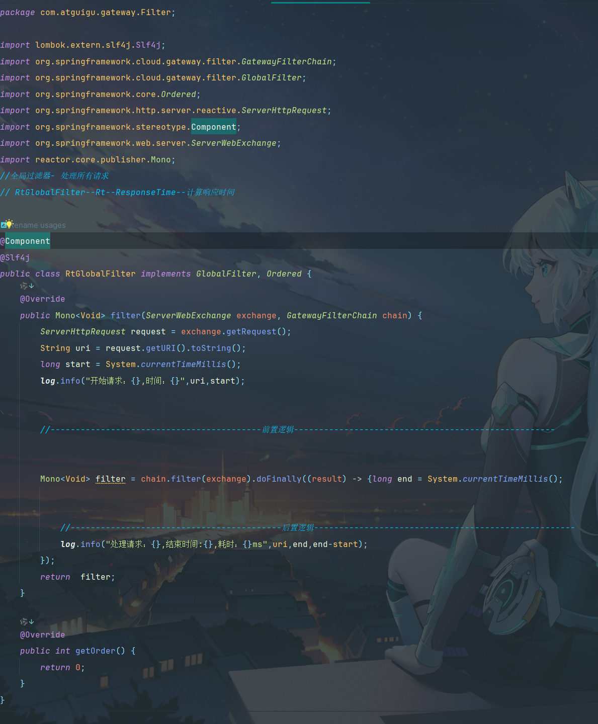 连包带类创建filter.RtGlobalFilter,实现GlobalFilter接口,这里以计算响应时间为例编码。