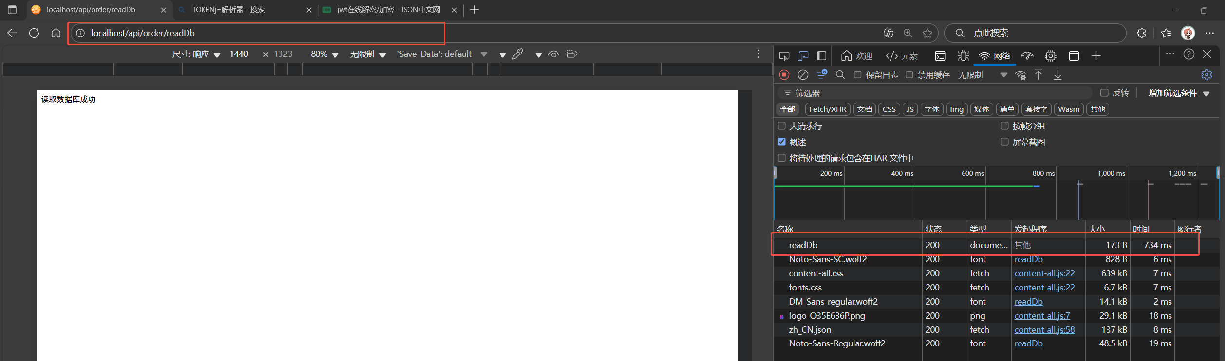 浏览器访问,同时F12打开开发者工具查看,readDb请求--响应