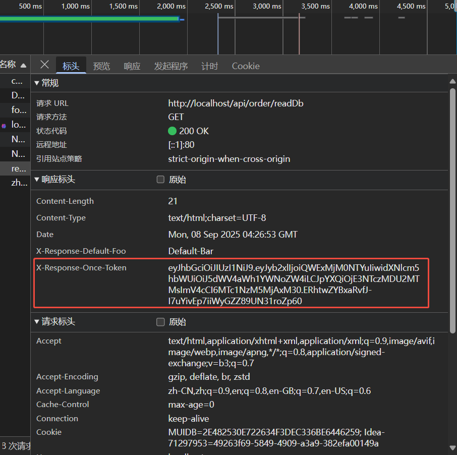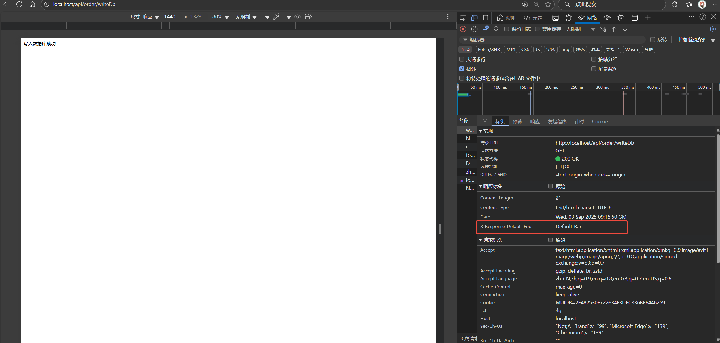 这次我们来以writeDb测试,浏览器访问后,按F12,查看writeDb请求标头,我们可以看到响应标头携带了我们刚才在配置文件中添加的参数,X-Response-Default-Foo, Default-Bar