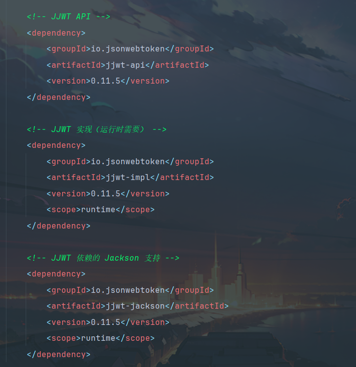 import java.util.Map;public class JWTutils {private static final Key SECRET_KEY = Keys.secretKeyFor(SignatureAlgorithm.HS256);private static final long EXPIRATION_TIME = 86400000; // 24小时/*** 生成 JWT* @param claims 自定义声明* @return JWT 字符串*/public static String generateToken(Map<String, Object> claims) {return Jwts.builder().setClaims(claims).setIssuedAt(new Date()).setExpiration(new Date(System.currentTimeMillis() + EXPIRATION_TIME)).signWith(SECRET_KEY).compact();}/*** 验证 JWT 并返回 Claims* @param token JWT 字符串* @return Claims 对象*/public static Claims validateToken(String token) {return Jwts.parserBuilder().setSigningKey(SECRET_KEY).build().parseClaimsJws(token).getBody();}/*** 检查 JWT 是否过期* @param claims Claims 对象* @return 是否过期*/public static boolean isTokenExpired(Claims claims) {return claims.getExpiration().before(new Date());}/*** 生成默认的 Claims(包含用户名和角色)* @param username 用户名* @param role 角色* @return Claims Map*/public static Map<String, Object> generateClaims(String username, String role) {Map<String, Object> claims = new HashMap<>();claims.put("username", username);claims.put("role", role);return claims;}