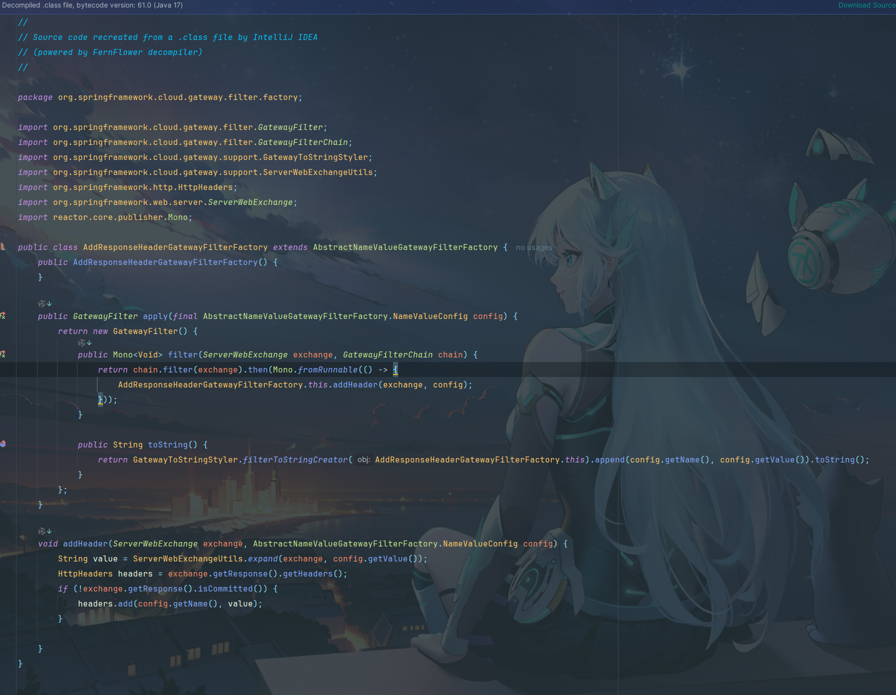我们首先来看一下Spring Cloud Gateway 内置的过滤器工厂AddResponseHeaderGatewayFilterFactory,看看我们自定义一个过滤器工厂需要哪些操作