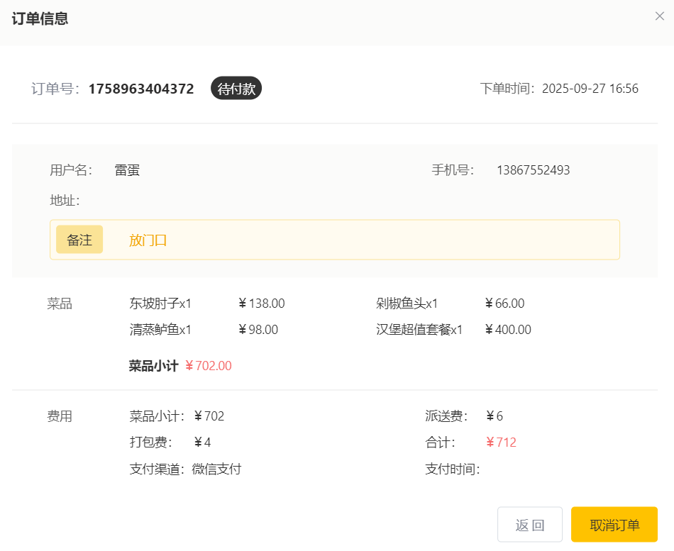- 判断订单状态是否可以取消【3已接单、4派送中、5已完成、6已取消】不可以取消