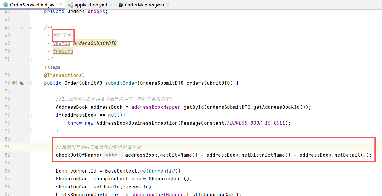在OrderServiceImpl的submitOrder方法中调用上面的校验方法