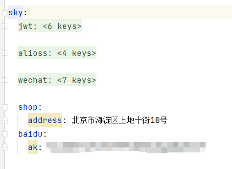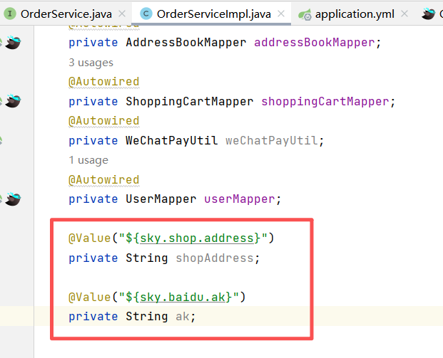 @Value("${sky.shop.address}")private String shopAddress;@Value("${sky.baidu.ak}")private String ak;