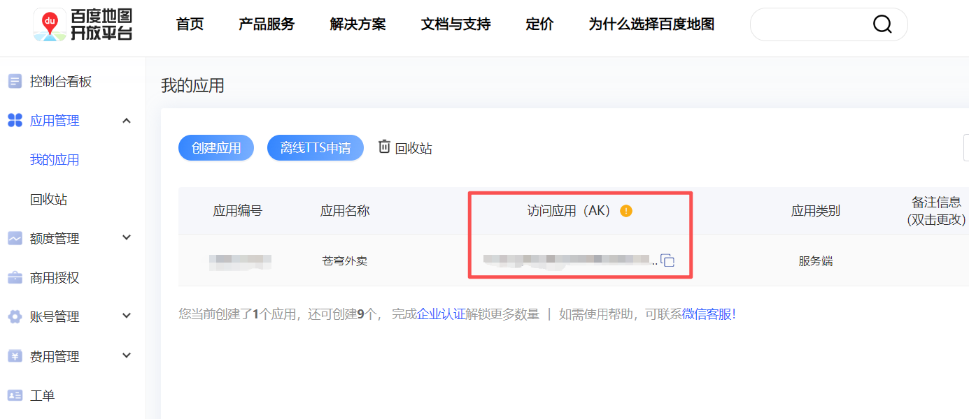 进入控制台,创建应用,获取AK: