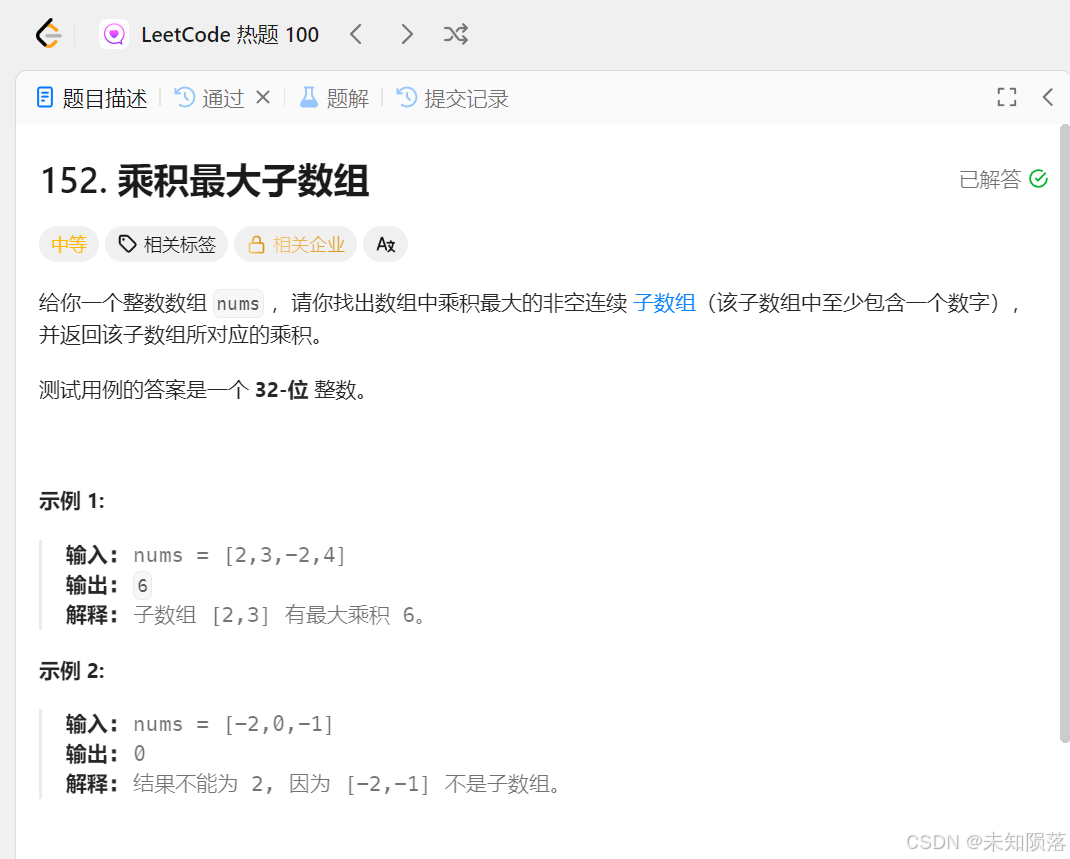public:int maxProduct(vector<int>& nums) {int n = nums.size();vector<int> f(n + 1), g(n + 1);f[0] = g[0] = 1;int ret = INT_MIN;for(int i = 1; i <= n; i++){int x = nums[i - 1], y = f[i - 1] * nums[i - 1], z = g[i - 1] * nums[i - 1];f[i] = max(x, max(y, z));g[i] = min(x, min(y, z));ret = max(f[i], ret);}return ret;}