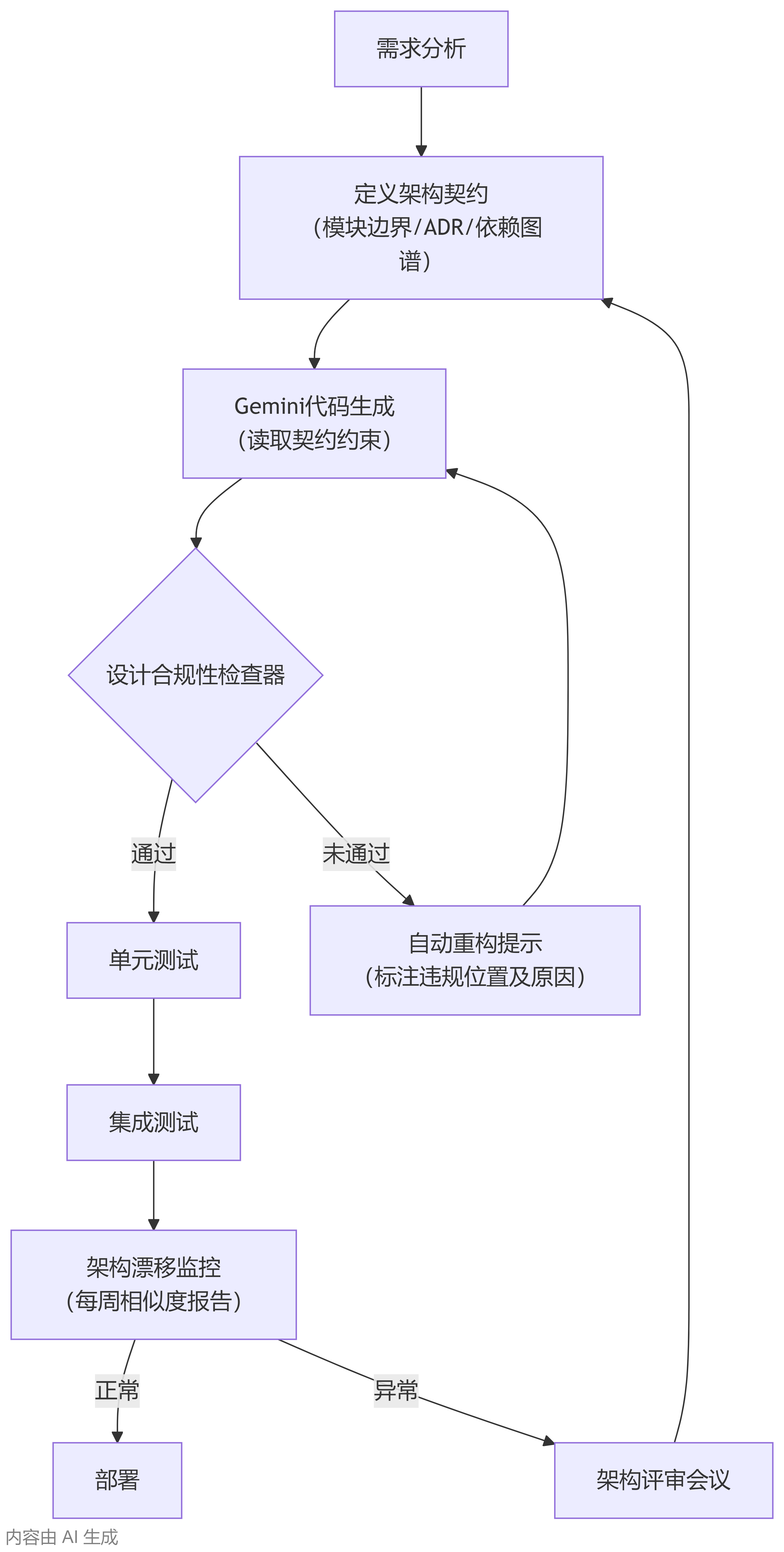Google的实践表明,静态设计文档无法应对AI的快速迭代。因此,其内部工具链集成了设计合规性检查器,通过以下机制持续验证AI生成代码: