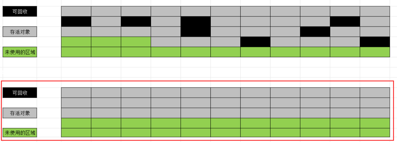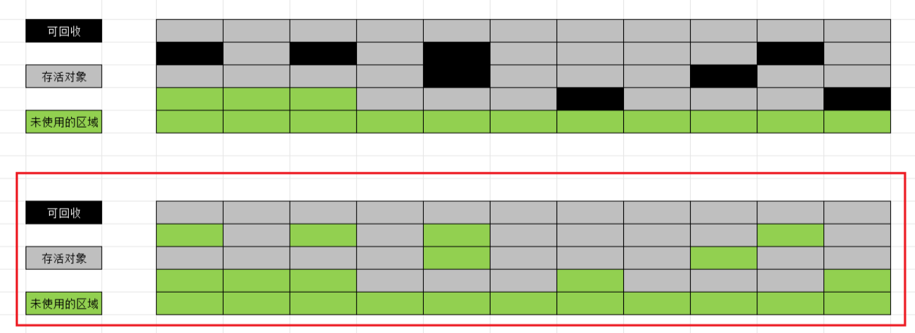 标记过程仍与"标记-清除"过程⼀致,但后续步骤不是直接对可回收对象进⾏清理,⽽是让所有存活对象都向⼀端移动,然后直接清理掉端边界以外的内存.