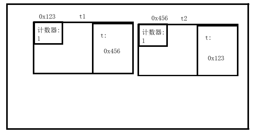public class Test {Test t;public static void main(String[] args) {//对于这两个new出的Test对象,我们称为t1与t2Test a = new Test();Test b = new Test();//在这里由于a引用了t1,b引用了t2,所以t1与t2的计数器都为1.a.t = b;b.t = a;//这里t1.t对t2进行了引用,t2.t对t1进行了引用.因此t1与t2的计数器都为2a = null;b = null;//将a与b都设为null后,a与b不再引用t1与t2.//但是t1.t仍在引用t2,t2.t仍在引用t1.此时t1与t2的计数器都为1.不视为已死}