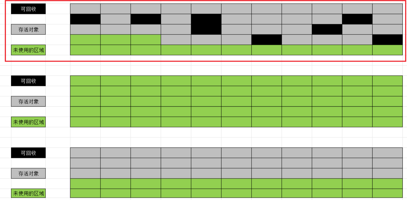 标记回收算法有一个严重的缺点:回收出的内存空间碎片化.过于碎片化的内存空间会阻碍内存的申请.当需要进行较大内存的申请时,内存碎片话会让内存总和虽然够,但是内存分布分散,无法分配出一块大内存.