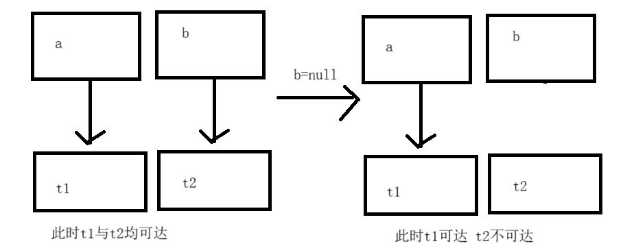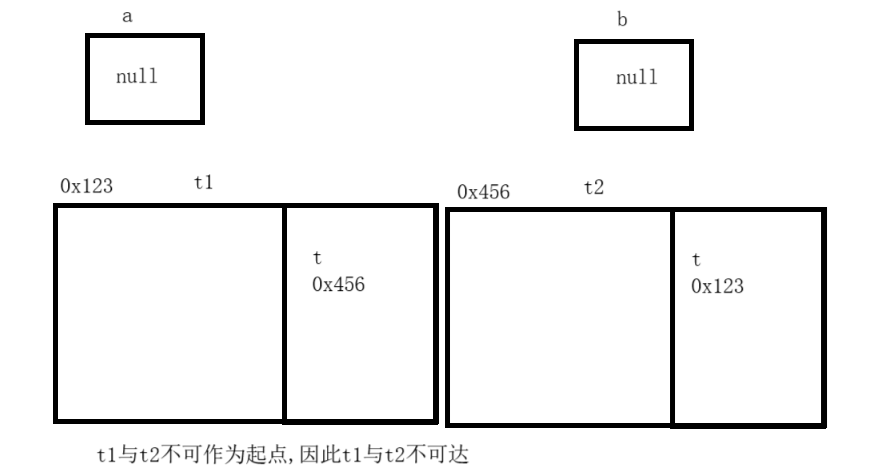 可达性分析可以解决循环引用问题,因为t1与t2不可以作为起点,所以在判断时,认为t1,t2均不可达.