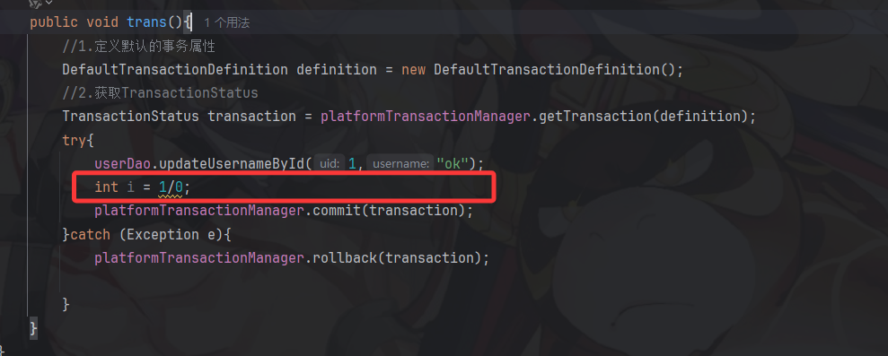 public void trans2(){// 调用TransactionTemplate的execute方法,传入事务回调接口(TransactionCallbackWithoutResult)transactionTemplate.execute(new TransactionCallbackWithoutResult() {// 重写回调接口的doInTransactionWithoutResult方法// 作用:该方法内的代码会运行在事务环境中,TransactionStatus参数用于控制事务状态(如标记回滚)@Overrideprotected void doInTransactionWithoutResult(TransactionStatus status) {try{// 说明:此操作会被Spring事务管理,若后续出现异常,该更新会被回滚userDao.updateUsernameById(1,"ojbk");int i = 1/0;}catch (Exception e){// 异常处理:当业务逻辑抛出异常时,手动标记事务为“需要回滚”status.setRollbackOnly();}}} );