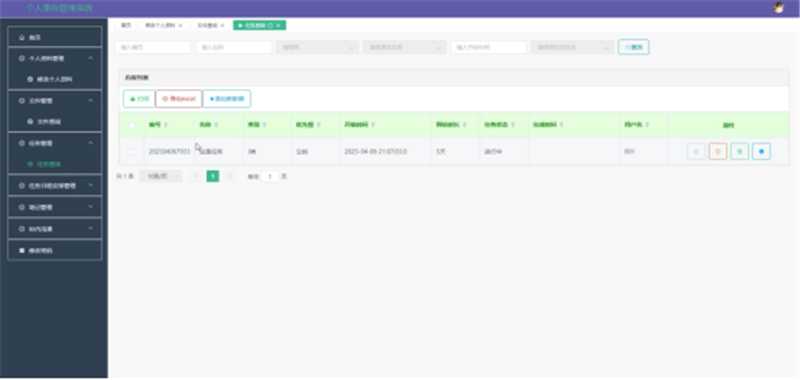 任务管理页面是用户进行个人任务规划与执行的重要工具。在此页面,用户可直观查看自己负责的所有任务列表信息,包括任务名称、截止时间、执行状态等关键属性。通过简洁明了的操作按钮与进度条展示,用户可轻松执行任务的开始、暂停、完成等操作,并实时查看任务执行进度。,系统还提供了任务提醒与逾期预警功能,帮助用户更好地管理自己的时间与任务。