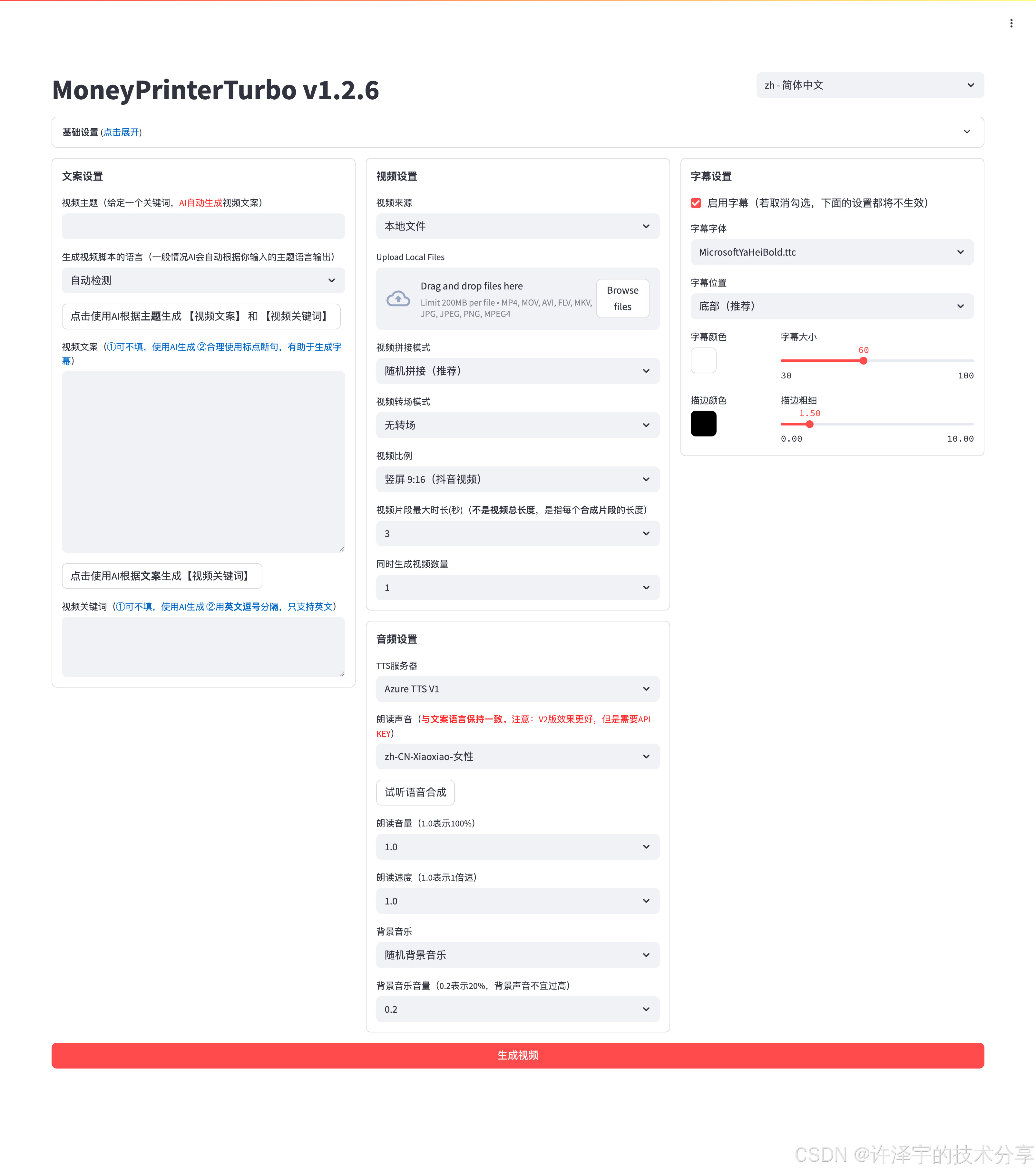 "只需要一个主题,就能自动生成高质量短视频" —— 这不是科幻电影的桥段,而是MoneyPrinterTurbo让我们触手可及的现实!