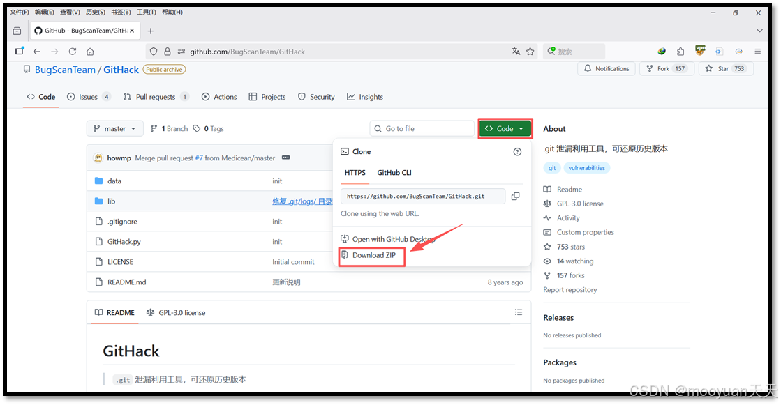 特别注意:不要下错版本,github有好几个同名的GitHack,下错了无法渗透成功。(特别注意不是https://github.com/lijiejie/GitHack这个网址,从它下载是错误的)。