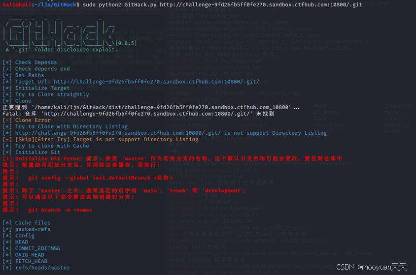 kali@kali:~/ljn/GitHack$ sudo python2 GitHack.py http://challenge-9fd26fb5ff0fe270.sandbox.ctfhub.com:10800/.git____ _ _ _ _ _ / ___(_) |_| | | | __ _ ___| | __