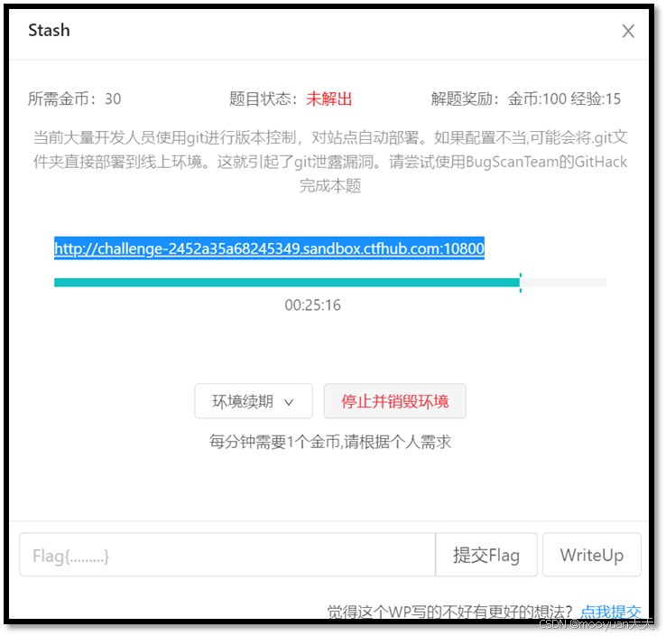 打开关卡如下所示,提示信息为“当前大量开发人员使用git进行版本控制,对站点自动部署。如果配置不当,可能会将.git文件夹直接部署到线上环境。这就引起了git泄露安全风险。请尝试使用BugScanTeam的GitHack完成本题”,提示本关卡可以利用.git泄露进行渗透测试。点击打开题目,此时系统自动创建Docker环境,下图蓝色部分的URL地址就是靶场环境。