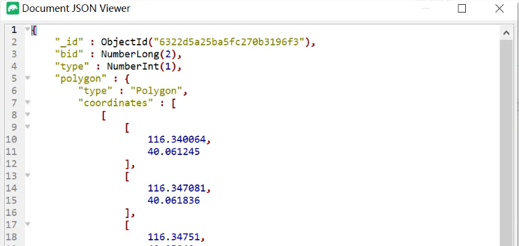 public class ServiceScopeEntity {@Id@JsonIgnoreprivate ObjectId id;/*** 业务id,可以是机构或快递员*/@Indexedprivate Long bid;/*** 类型 {@link com.ms.scope.enums.ServiceTypeEnum}*/@Indexedprivate Integer type;/*** 多边形范围,是闭合的范围,开始经纬度与结束经纬度必须一样* x: 经度,y:纬度*/@GeoSpatialIndexed(type = GeoSpatialIndexType.GEO_2DSPHERE)private GeoJsonPolygon polygon;private Long created; //创建时间private Long updated; //更新时间
