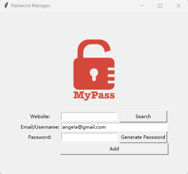 import jsondef generate_password():letters = ['a', 'b', 'c', 'd', 'e', 'f', 'g', 'h', 'i', 'j', 'k', 'l', 'm', 'n', 'o', 'p', 'q', 'r', 's', 't', 'u', 'v', 'w', 'x', 'y', 'z', 'A', 'B', 'C', 'D', 'E', 'F', 'G', 'H', 'I', 'J', 'K', 'L', 'M', 'N', 'O', 'P', 'Q', 'R', 'S', 'T', 'U', 'V', 'W', 'X', 'Y', 'Z']numbers = ['0', '1', '2', '3', '4', '5', '6', '7', '8', '9']symbols = ['!', '#', '$', '%', '&', '(', ')', '*', '+']password_letters = [choice(letters) for _ in range(randint(8, 10))]password_symbols = [choice(symbols) for _ in range(randint(2, 4))]password_numbers = [choice(numbers) for _ in range(randint(2, 4))]password_list = password_letters + password_symbols + password_numbersshuffle(password_list)password = "".join(password_list)password_entry.delete(0, END)password_entry.insert(0, password)pyperclip.copy(password)def save():website = website_entry.get()email = email_entry.get()password = password_entry.get()new_data = {website: {"email": email,"password": password,}}if len(website) == 0 or len(email) == 0 or len(password) == 0:messagebox.showinfo(title="Oops",message="Please make sure you haven't left any fields empty.")else:try:with open("data.json", "r") as data_file:data = json.load(data_file)except FileNotFoundError:with open("data.json", "w") as data_file:json.dump(new_data, data_file, indent=4)else:data.update(new_data)with open("data.json", "w") as data_file:json.dump(data, data_file, indent=4)finally:website_entry.delete(0, END)password_entry.delete(0, END)def find_password():website = website_entry.get()try:with open("data.json") as data_file:data = json.load(data_file)except FileNotFoundError:messagebox.showinfo(title="Error", message="No Data File Found.")else:if website in data:email = data[website]["email"]password = data[website]["password"]messagebox.showinfo(title=website, message=f"Email: {email}\nPassword: {password}")else:messagebox.showinfo(title="Error", message=f"No details for {website} exists.")# UI SETUP