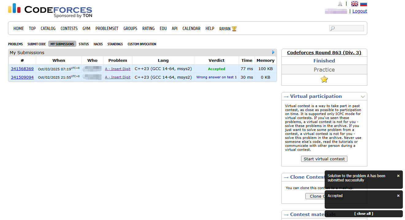 by inserting a digit after the 3th or after the 4th digit of the number.Input