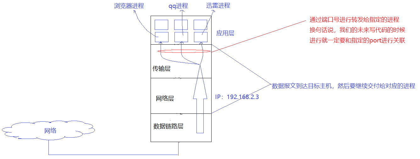 但是这⾥要思考⼀个问题,数据传输到主机是目的吗?数据传输到主机不是目的,而是手段。到达主机内部,在交给主机内的进程,才是目的。