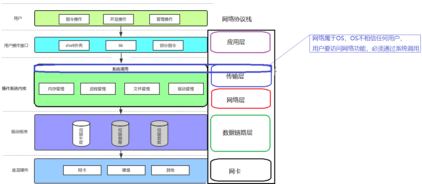 如果我们了解了系统,也了解了网络协议栈,我们就会清楚,传输层是属于内核的,那么我们要通