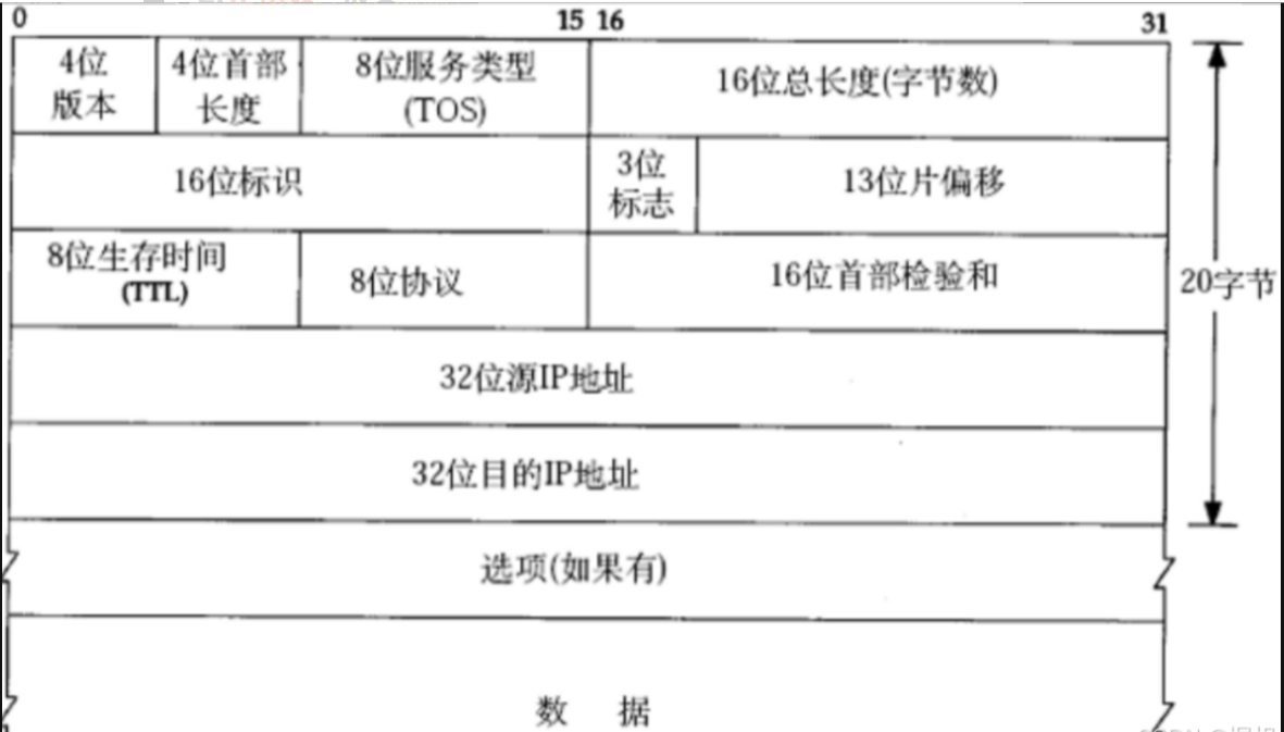 协议(Protocol) | 8 | 指明上层传输层协议 | 通过固定数值映射上层协议,核心映射关系:- 1:ICMP(互联网控制报文协议,如 ping)- 6:TCP(传输控制协议,如 HTTP、SSH)- 17:UDP(用户数据报协议,如 DNS、DHCP)- 41:IPv6(用于 IPv4/IPv6 过渡) |