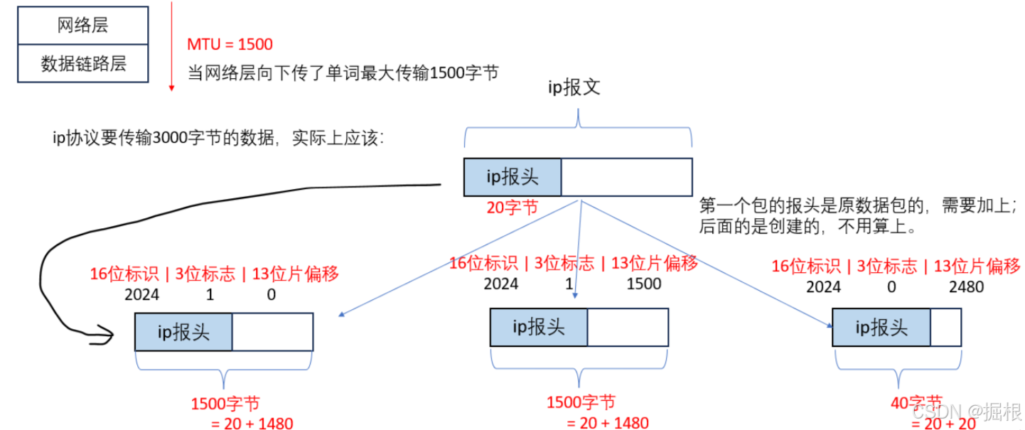 - UDP 协议:无发送缓冲区,应用层发多少数据,UDP 就直接封装成数据报交给 IP 层。若 UDP 数据报(含 IP 头部)超过 MTU,IP 层必须进行分片,否则无法传输。