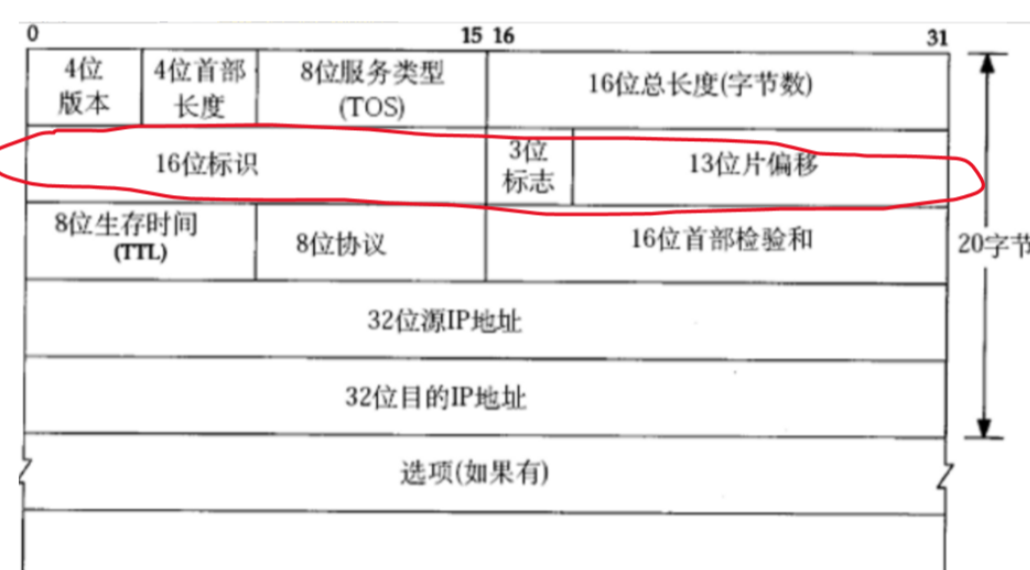 16 位标识(ID) | 16 位 | 唯一标识一个 IP 数据包:同一原始数据包的所有分片,ID 值完全相同;不同数据包的 ID 值不同 |
