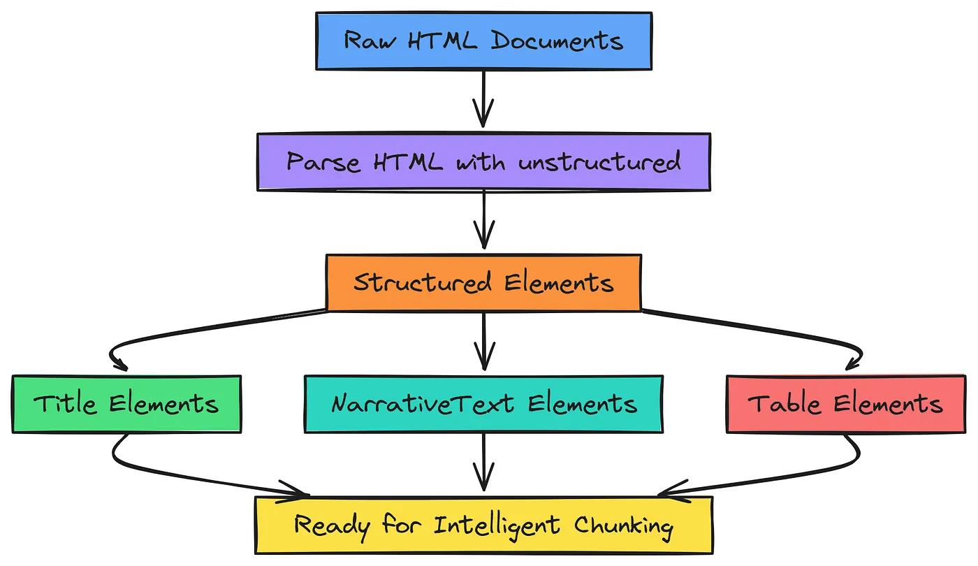 库对HTML进行高级解析。与基础方法不同,该库会将文档拆分为“标题(Title)”“叙述文本(NarrativeText)”“表格(Table)”等有意义的元素列表。