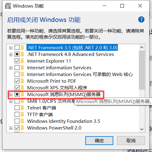 在"Windows功能"对话框中,找到 "Microsoft Message Queue (MSMQ) 服务器"
