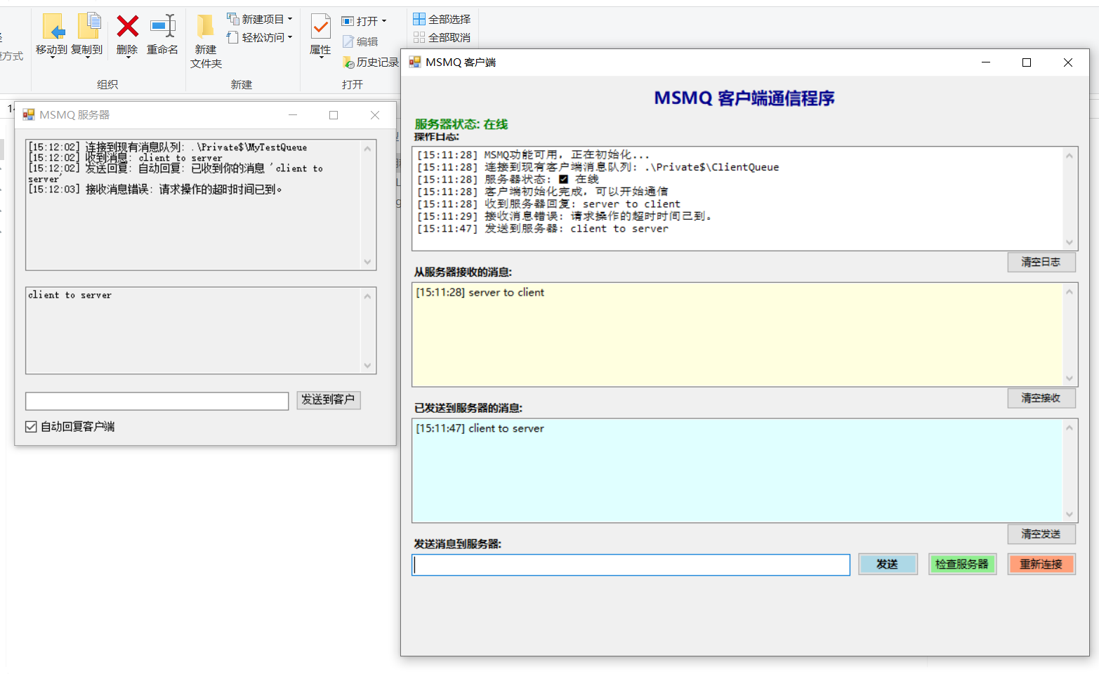 {try{if (!IsMSMQAvailable()){// 错误处理和用户指导AppendLog("MSMQ功能未安装!");AppendLog("请启用Windows MSMQ功能:");// ... 详细指导信息btnSendToServer.Enabled = false;btnCheckServer.Enabled = false;txtMessageToServer.Enabled = false;return;}AppendLog("MSMQ功能可用,正在初始化...");InitializeMSMQ();}catch (Exception ex){AppendLog($"检查MSMQ可用性失败: {ex.Message}");}