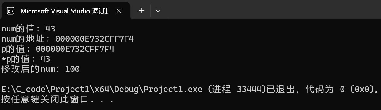 #include <stdio.h> int main() {int num = 43;/*野指针风险:若省略& num(如int* p; 后直接解引用* p = 43; ),p成为未初始化的野指针,解引用将引发段错误(Segmentation Fault)*/int* p = # // p存储num的地址// 指针声明:int *p定义一个指向整型的指针变量p。// *表示p是指针类型,int限定其指向的数据类型为整型。/* 指针大小:32位系统占4字节,64位系统占8字节,与int大小无关。取地址操作:&num 获取num的内存地址(如0x7ffd3a4c),并赋值给p。此时p存储该地址,p与& num等价。*//*空指针保护:可初始化为NULL(如int* p = NULL; ),使用前需检查:*/if (p == NULL) {*p = 100; // 安全操作}printf("num的值: %d\n", num); // 输出43printf("num的地址: %p\n", &num); // 输出地址(如0x7ffd3a4c)printf("p的值: %p\n", p); // 输出与&num相同printf("*p的值: %d\n", *p); // 输出43*p = 100; // 修改p指向的值printf("修改后的num: %d\n", num); // 输出100/* 解引用操作:通过* p访问p指向的内存数据。* p等价于num,值为43。修改* p(如* p = 100; )会同步改变num的值 类型安全: int *p确保解引用时按int类型解释内存数据(4字节对齐,小端序/大端序依赖系统)。错误类型匹配(如char *p = #)会导致数据解析错误 */return 0; }