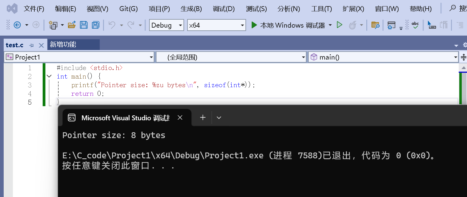 #include <stdio.h> //这是一个预处理指令,用于引入标准输入输出库(stdio.h) //因为程序中使用了printf函数(用于输出内容到控制台),而printf的声明就包含在stdio.h中,所以必须通过该指令引入这个库才能正常使用printf int main() {printf("Pointer size: %zu bytes\n", sizeof(int*));return 0; } //main函数是 C 程序的入口点,程序从main函数开始执行。 //int表示main函数的返回值类型为整数,通常用于表示程序的执行状态(return 0表示程序正常结束) //sizeof(int*):sizeof是 C 语言的一个运算符,用于计算括号中数据类型或变量所占用的字节数。这里int*表示 “指向 int 类型的指针”,sizeof(int*)即计算这种指针在当前系统中占用的内存字节数 //printf输出:printf函数用于将内容打印到控制台。格式字符串"Pointer size: %zu bytes\n"中,%zu是格式化占位符,用于匹配sizeof的返回值(size_t类型,无符号整数),最终会被替换为int*指针的字节数。 //例如,在 32 位系统中,指针通常占用 4 字节;在 64 位系统中,指针通常占用 8 字节,因此程序输出可能是Pointer size: 8 bytes(取决于运行环境)