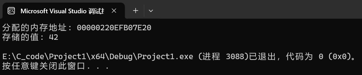 #include <stdio.h> #include <stdlib.h> // 包含 malloc 和 exitint main() {int* p = malloc(sizeof(int));if (p == NULL) {fprintf(stderr, "错误:内存分配失败!\n");return 1;}*p = 42; // 写入数据printf("分配的内存地址: %p\n", (void*)p);printf("存储的值: %d\n", *p);free(p); // 释放内存p = NULL; // 避免悬垂指针return 0; }