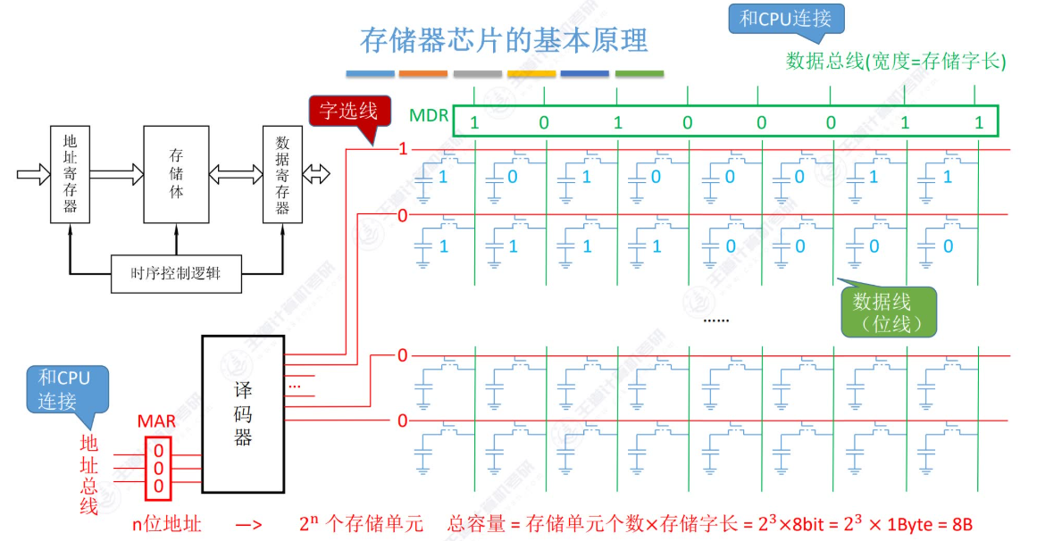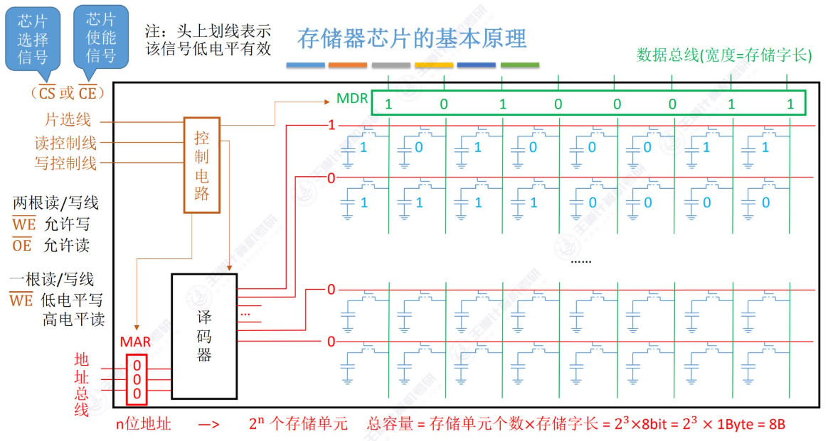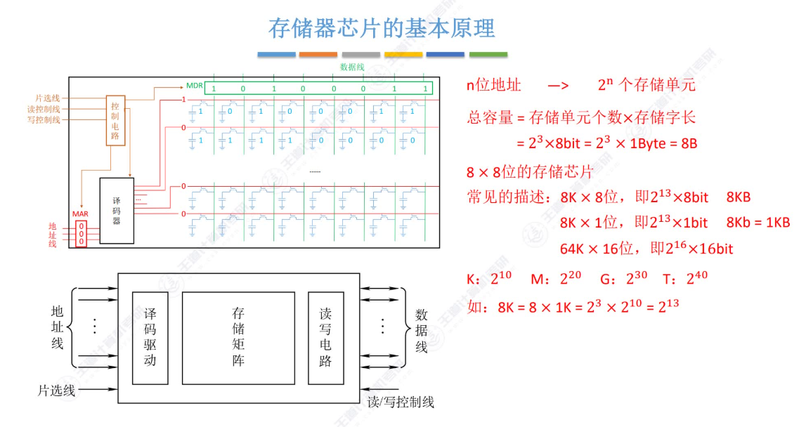 当一个存储器里面由n位地址,这里的n位地址表示的是,这个地址寄存器MAR的位数有n位,这个时候存储单元就有2的n次方的存储单元,然后要计算出总容量=用存储单元个数*存储字长,基本常识是8个比特为1个字节,然后Kb(表示的是存储单元个乘以的存储字长的单位为bit),KB(存储字长的单位为Byte),此时存储芯片是,这个存储单元的个数单位1K = 2^10,那么8K = 2^13,这个时候就可以理解KB怎么来了