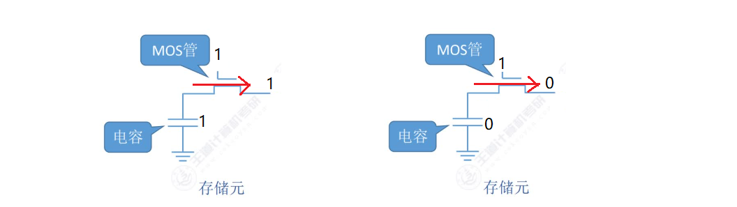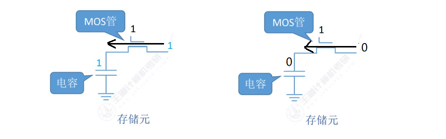 外部传入一个0或者1数据,然后此时MOS管导通,这个时候电容可以为此改变自己的状态,形成高电压或者低电压,从而形成0或者1