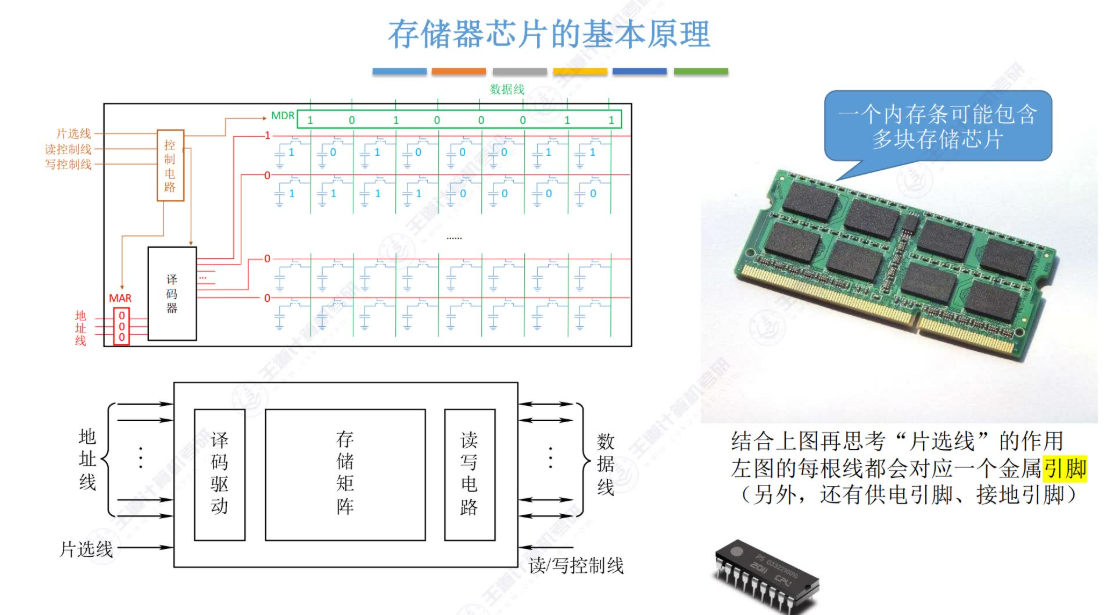 这个片连线是表示,如上如的内存条可以看到一个内存条由很多的存储器存储,如果要去拿到对应的数据的时候,就是要用片连线来选择在哪一个存储器进行拿出数据,因为不可能对应的数据同时出现在两个存储器里面,然后读写就很好理解了。