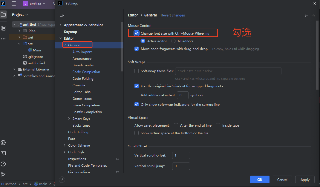-> 勾选Change font size (Zoom) with Ctrl+Mouse Wheel