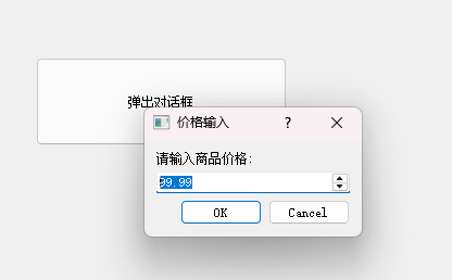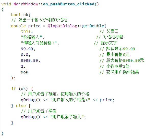 double getDouble(QWidget *parent, // 父窗口,通常是当前窗口的this指针const QString &title, // 对话框的标题const QString &label, // 输入框前面的提示文字double value = 0, // 默认显示的值double min = -2147483647, // 允许输入的最小值double max = 2147483647, // 允许输入的最大值int decimals = 1, // 小数点后保留几位bool *ok = nullptr, // 用于判断用户点击了确定还是取消Qt::WindowFlags flags = Qt::WindowFlags() // 窗口标志,一般用默认值