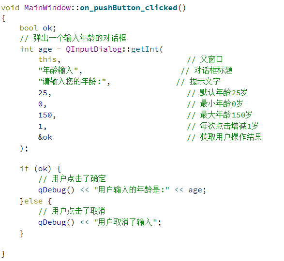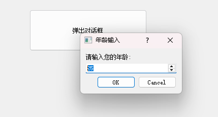 int getInt(QWidget *parent, // 父窗口const QString &title, // 对话框标题const QString &label, // 提示文字int value = 0, // 默认值int min = -2147483647, // 最小值int max = 2147483647, // 最大值int step = 1, // 每次点击增减按钮的变化步长bool *ok = nullptr, // 用户操作结果Qt::WindowFlags flags = Qt::WindowFlags() // 窗口标志