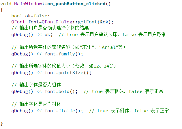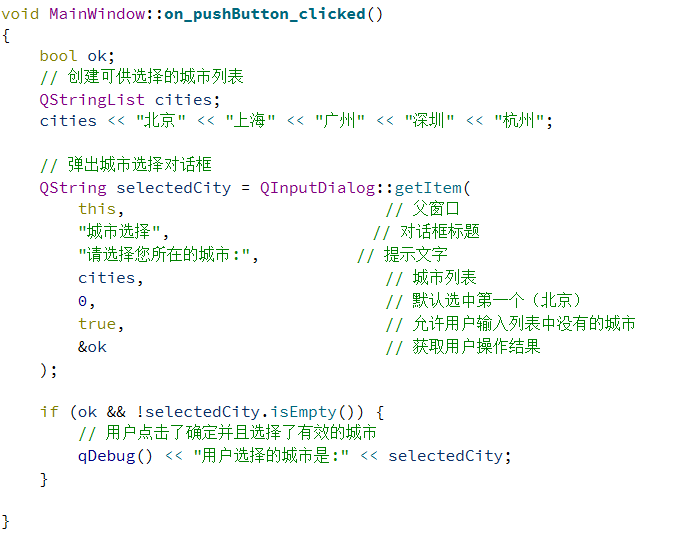QString getItem(QWidget *parent, // 父窗口const QString &title, // 对话框标题const QString &label, // 提示文字const QStringList &items, // 可供选择的项目列表int current = 0, // 默认选中的项目索引bool editable = true, // 是否允许用户编辑(输入新值)bool *ok = nullptr, // 用户操作结果Qt::WindowFlags flags = Qt::WindowFlags(), // 窗口标志Qt::InputMethodHints inputMethodHints = Qt::ImhNone // 输入法提示