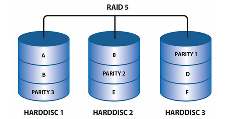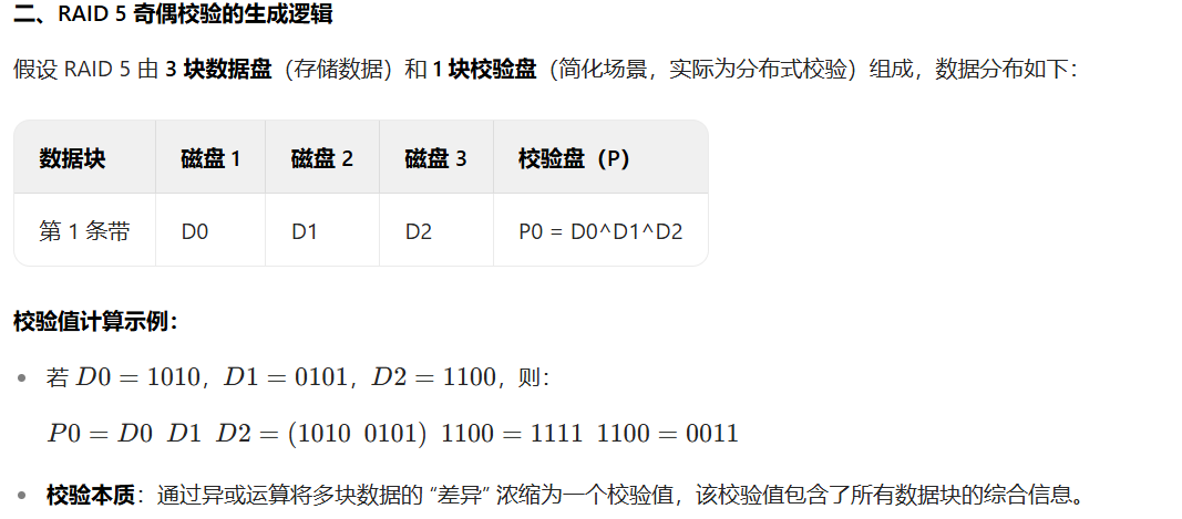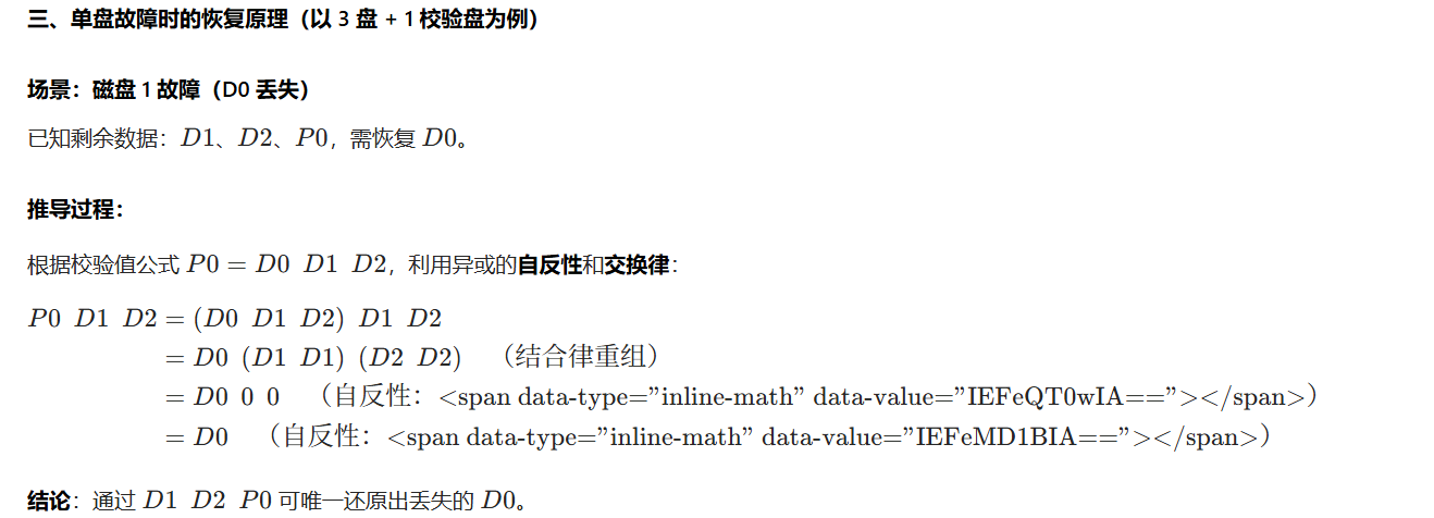 其最少由3 块磁盘组成,只允许同时损坏一块磁盘,否则无法修复