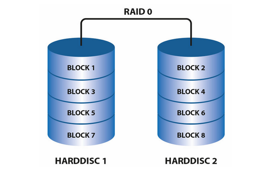 用多块硬盘组成,在写入数据时将数据分为多份同时写入,以至于写的效率极高,但安全性不足,至少两块磁盘组成,否则失去了写入效率高的意义